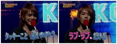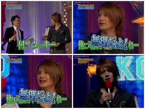 Then before KEIKO's performance, Teppei was saying "well then, i'll make my hosting/intro speech..." and Takki & Kazu-chan were both objecting ("Iranai yo...iranai!") Then suddenly Teppei goes "Nani Takki?....What's with the 'But I want to b the host --" and Takki went "EHHHHHH!?!? impossible da yo!/i cant do that da yo!" BUAHAHAHHAHAHAHAHAH~